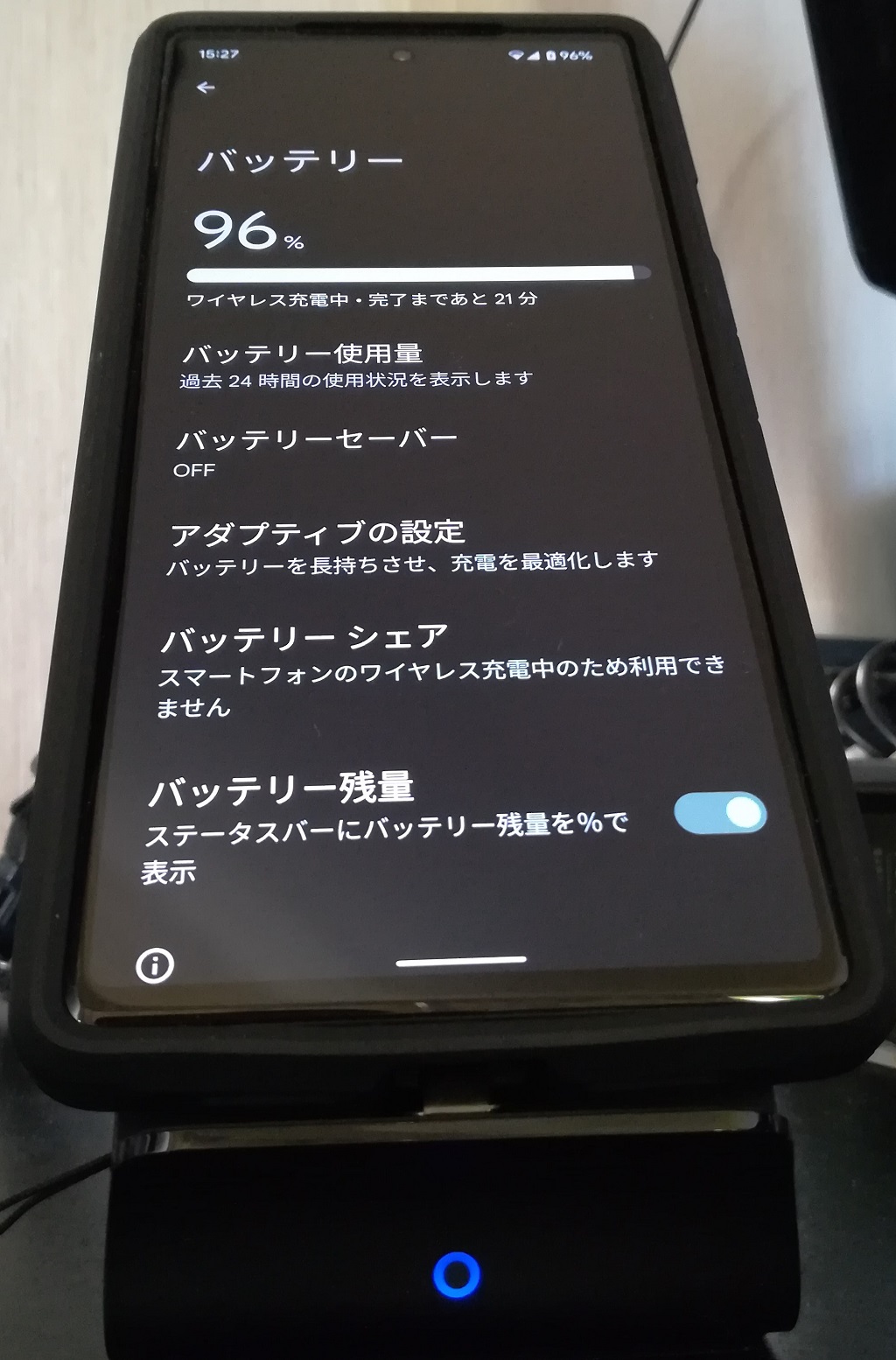 充電器のLEDはブルー点灯して充電中状態を示していますし、Pixel 6 本体の「バッテリー」機能でもワイアレス充電中で有ることが確認できます。